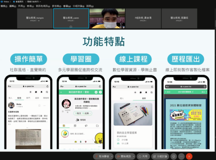 因疫情關係轉為線上辦理的資安體驗營原本以東部學子為主,也因線上無遠弗屆吸引全台共24校75位學生報名參加。為了讓學員在營隊中能有效學習,講師們事前透過【e-Peer共學平台】上傳各主題課程大綱與預習素材,幫學員擁有基礎先備知識,游照臨講師表示可以透過上傳檔案與連結方式,課前提供給學員的功能滿方便的;此外,營隊全程也運用平台學習圈管理學員、發布公告、指派課後練習作業,以及蒐集學員課程心得收穫,余承澧講師表示,學員透過學習圈分享心得或問題,講師很容易就能得知學習狀況,便於隨時調整課程難度,讓活動及課程進行更流暢。