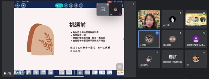 最後世如校長勉勵老師們,帶領學生製作學習歷程檔案,只要不斷的去實踐、不 斷的去改進,找到合適的教學方法跟框架,那學習歷程就會是課程中自然的產出, 而不是一個負擔。第二季慧治 online café 從 3 月份開始,每月 1 次,每次 1 小 時,邀請教師們線上歡聚,用一杯咖啡的時間,聊聊新課綱大小事。