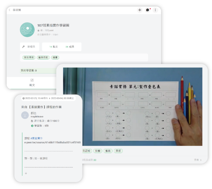 智傑老師嘗試將【e-Peer共學平台】導入現正教授的兩個班級中運用,藉由「學習圈」功能區分不同班級,創建屬於班級的教學群組。同時善用多元課程中含有提問範例的「想一想」功能來設計符合課程所需的引導提問,指派為課堂作業,讓學生能在學習圈中交流。「多元課程」不僅有老師錄製的示範操作影片,可以讓學生課後依自己的進度複習。「想一想」也幫助學生練習記錄下完整的學習歷程,同時將原本不便存放的紙本畫紙作品以數位的型態永久保存下來。