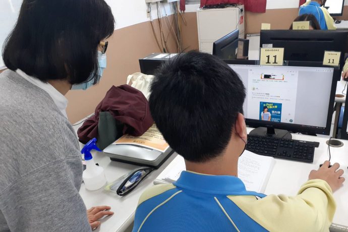 藍老師在課堂上指導同學們使用e-Peer共學平台製作學習歷程。