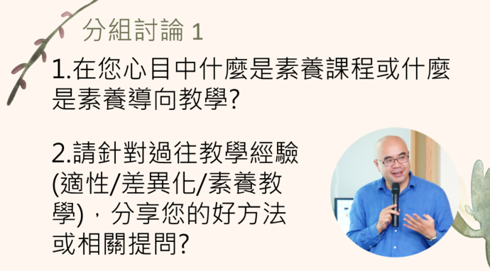 歸納老師們的困擾後發現到,大家最想知道的其實是如何「深度備課」?洪逸文老師建議應「將自己過去學習的部分重新解構再重組,把這樣的探索經驗和方法教給學生,即能落實素養教學於生活中。」逸文老師也以語文課程為例,示範如何透過提問的方式引發學生的好奇,牽引同學進入文章的情境,引導學生從詩中去體驗文字,透過學習任務延伸連結,轉換他心中的感受至經驗中的情境,強化感受和經驗的連結性,讓學生經驗到學習就在生活中!