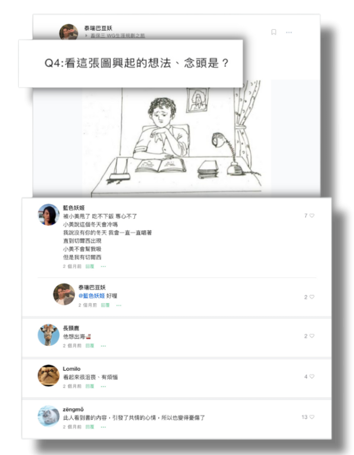 曾老師觀察到:平台類似社群媒體的特點,讓同學更能貼近生活中面對的人際互動議題,例如:「暱稱」讓學生安心的留言互動,減少月暈效應及偏見,較不敢發言的同學也仍有表達想法的空間!