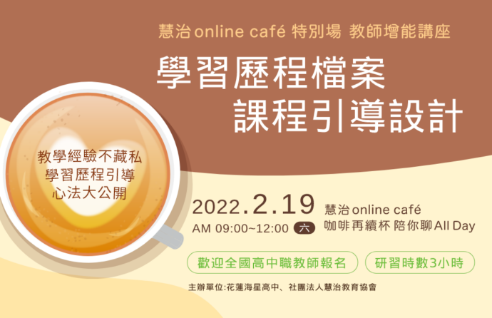 慧治 online café 特別場-學習歷程檔案x課程引導設計 pea_official–跨校教師交流、活動訊息–2022-02-192023-07-25 深受108課綱之苦的教師夥伴們,慧治 o […]